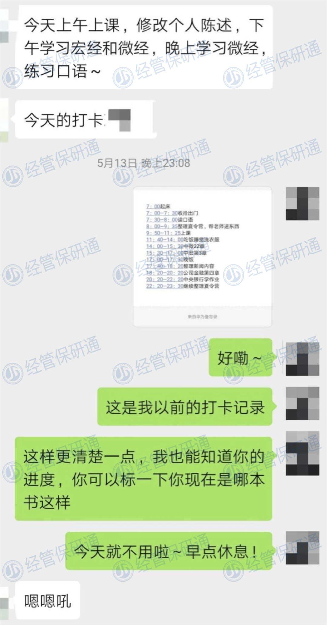接着,学姐又帮我制定出了目标院校和复习计划,并且每天督促我学习打卡,我觉得这样效率一下就上来了。不像之前那样,总找不到复习方向,而且心态也贼焦虑,静不下来心学习。到了六月份,学习压力大,又被许多院校拒,心态真的超崩,还好可以跟学姐吐槽一下,再及时调整一下状态,迎接未知的明天。不得不说,在保研中,良好的心态真的超级超级重要。