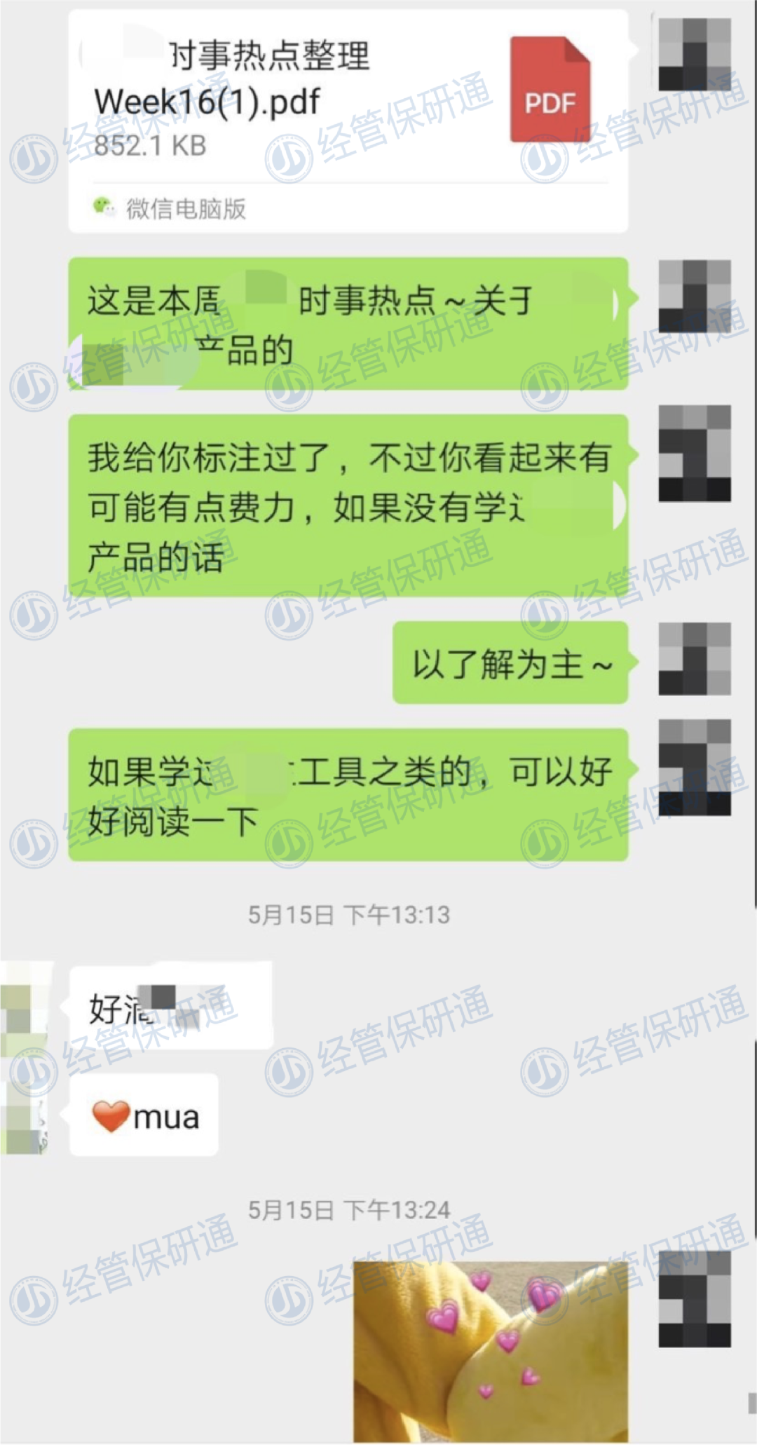 此外,我们还为学员提供保研所需的全套学习资料,包括但不限于雅思学习资料包、专业课学习资料包等一系列线上精品学习资料;班主任每周还会在群里分享经管保研通新闻部每周搜集的时事热点新闻供学员阅读学习。