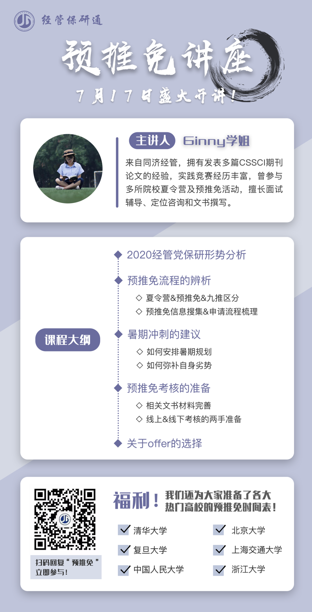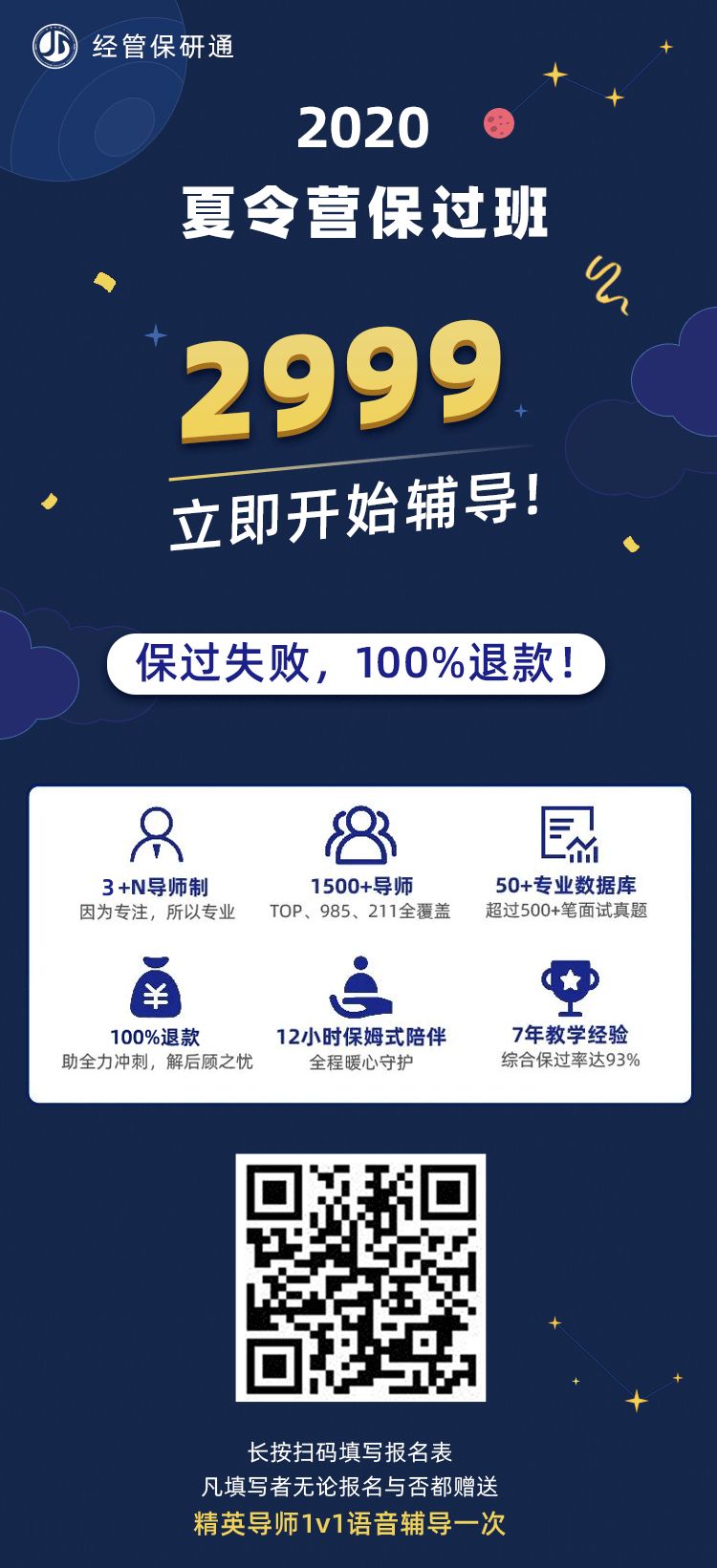 夏令营已经接近尾声,入营及优营offer也在陆续发送。为了让各位保研er在参营中稳拿offer,经管保研通2020夏令营保过班持续招生中!