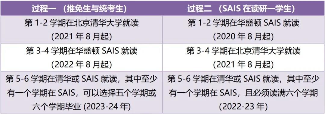 学习方式:整个项目为全英语授课。 清华大学国际关系学系研究生课程包括全球安全机制设计、世界政治与中国、国际能源与环境治理体系、公共外交:全球和比较的视角、全球化中的伦理争议、发展政治经济学、中国金融发展、公共政策分析等。 约翰∙霍普金斯SAIS课程要求学生自选专业方向、完成国际经济专业课程、定量分析方法、两门核心课程/考试、语言能力测试以及研究生结业项目。 学习期限最短为28个月(五个学期),按申请类型不同有两种过程: